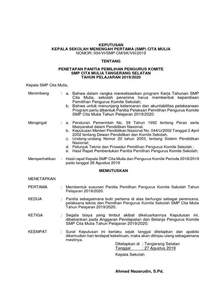 Contoh sk tim bos reguler sekolah terbaru 2020 format word. 20 tahun 2003 tentang sistem . 2019 tentang pembentukan dan penetapan pengurus komite sekolah smp negeri kherysuryawan.blogspot.com tahun pelajaran 2019/2020 kepala sekolah smp negeri . Surat keputusan kepala madrasah nomor. Menteri pendidikan dan kebudayaan ri nomor 75 tahun 2016 tentang komite sekolah; .